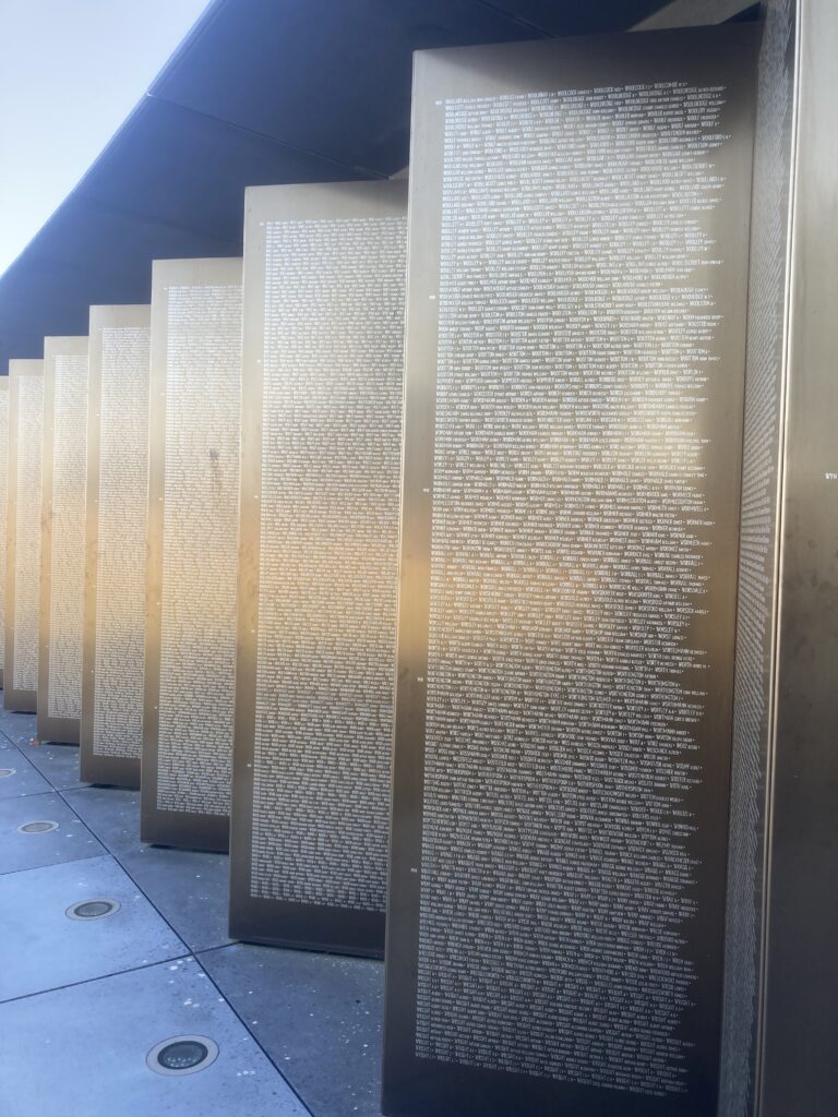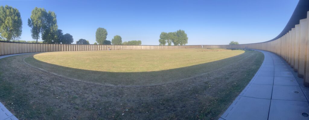 A coté se trouve un autre monument : l’anneau du souvenir. Un immense anneau rempli de stèles où sont écrits les noms de 580000 soldats de toutes nationalités (amis ou ennemis) morts dans la région lors de la guerre 14-18. L’anneau est en équilibre au bord du vide pour montrer que la paix est quelque chose d’instable et fragile.