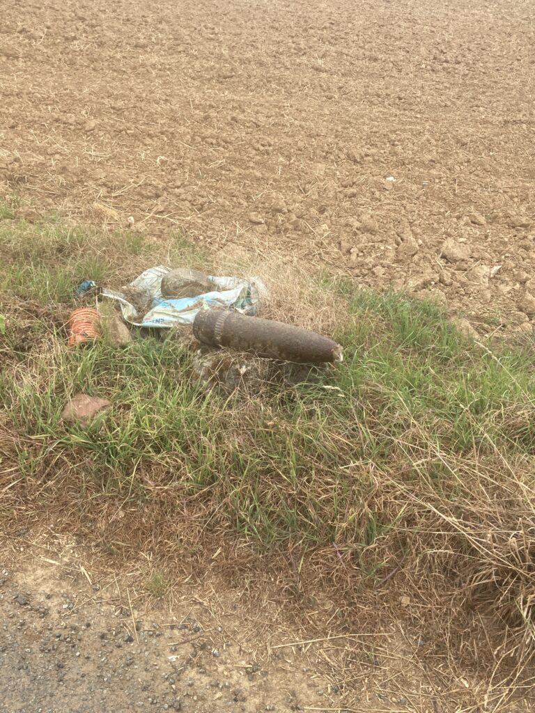 Un obus de la guerre 14/18 sur le bord du chemin ! Les agriculteurs qui déterrent des obus avec leur tracteur les mettent sur le bord du chemin et appellent un service qui les prend en charge.